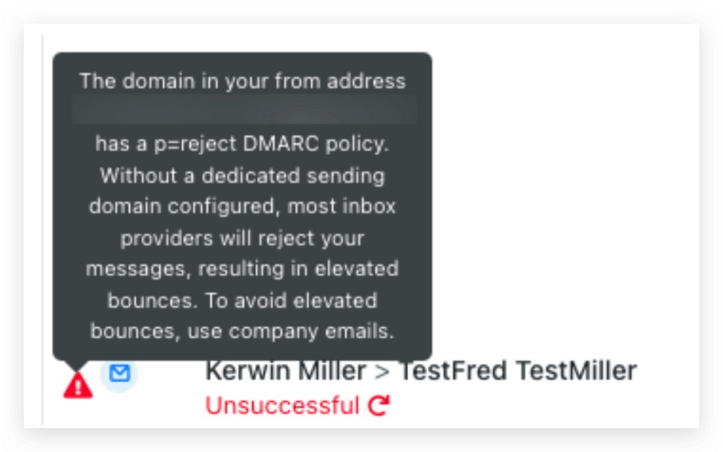 El dominio de su dirección de remitente (kate@goCentryka.com) tiene una política DMARC de rechazo. Sin un dominio de envío dedicado configurado, la mayoría de los proveedores de bandeja de entrada rechazarán sus mensajes, lo que resultará en un alto número de rebotes. Para evitarlo, utilice correos electrónicos de empresa.