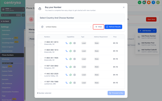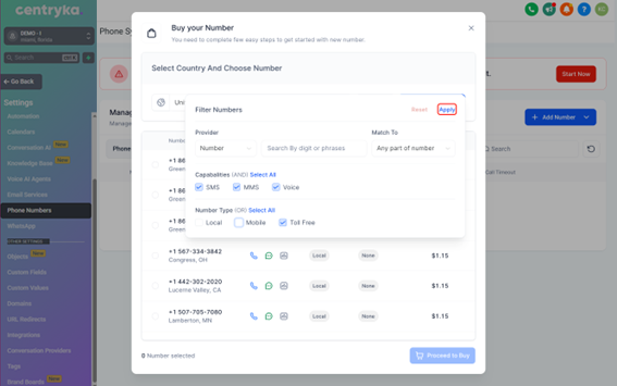 - Paso 6. Haga clic en filtros y seleccione el tipo de número de teléfono como gratuito y presione buscar.