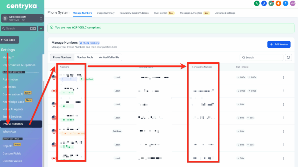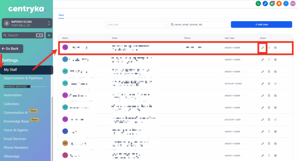 Vaya a Subcuenta > Configuración > Mi Personal > Editar usuario específico. Asegúrese de que su número de teléfono (el número al que llama para hablar con él) no sea el mismo que el número de Centryka (el número que obtuvo de Centryka).