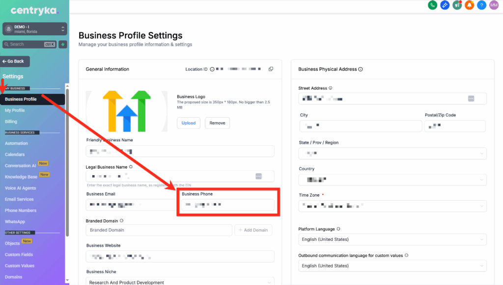 También revisa Subcuenta > Configuración > Perfil de empresa > Teléfono de empresa. Este es el número de respaldo al que se enruta la llamada entrante. Compruébalo, pero también llama a este número para ver si se enruta al número de alto nivel. Podría parecer un número diferente que todavía está configurado para enrutar al número de alto nivel, así que pruébalo manualmente.
