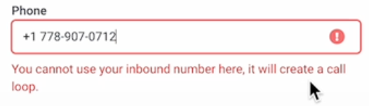 También revisa Subcuenta > Configuración > Números de teléfono > Número de reenvío. El número de reenvío debe ser diferente del número de teléfono.