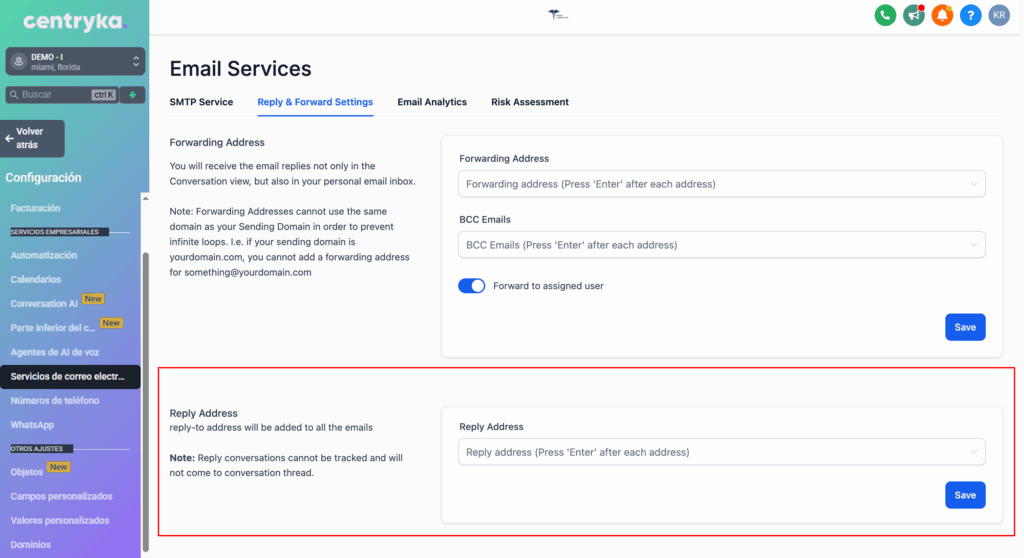 Ahora tenemos la opción de Agregar una dirección de respuesta. Todos los correos entrantes se enviarán a esa dirección en lugar de a la pestaña Conversación.