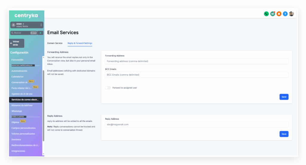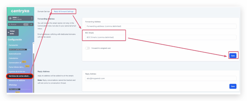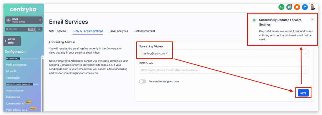 IMPORTANTE: Las direcciones de reenvío y los correos con copia oculta solo funcionan con Mailgun y LC Email. No ofrecemos compatibilidad con otros proveedores SMTP.