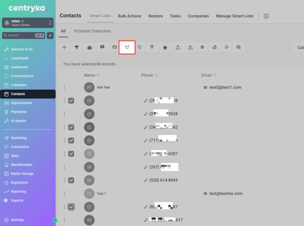 Una vez seleccionados los contactos, Click en el icono Add Tag en la barra de acciones en la parte superior de la pantalla.
