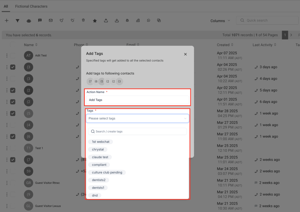 En la ventana emergente Add Tags, introduce un nombre para tu acción en el campo Action Name. Luego, Click en el dropdown del campo Tags y selecciona una o más etiquetas de la lista.