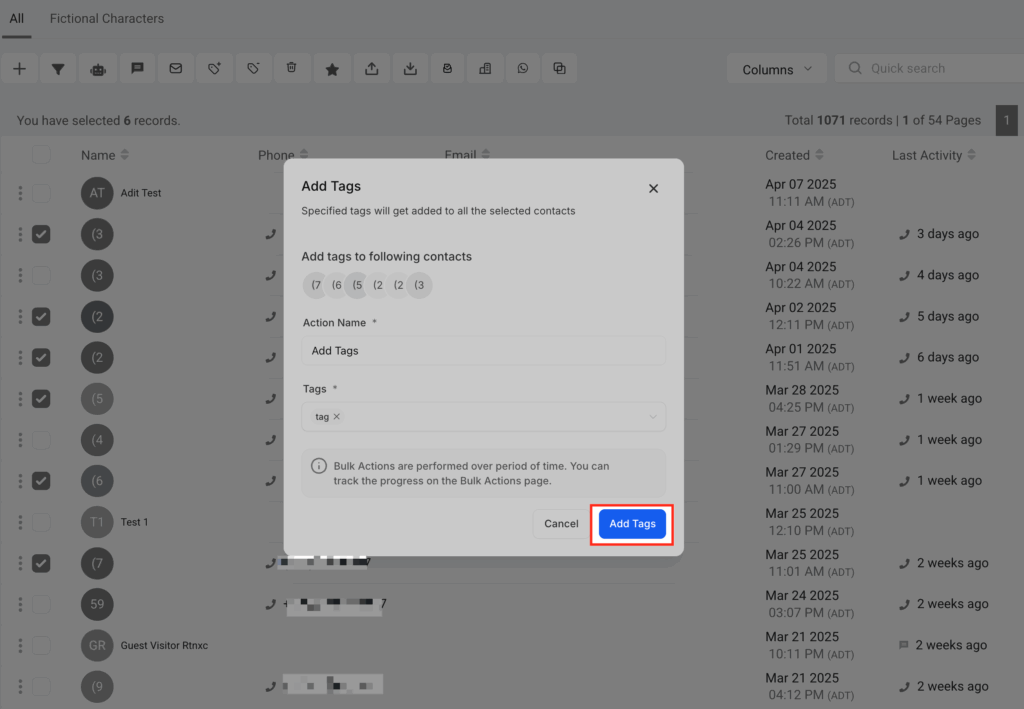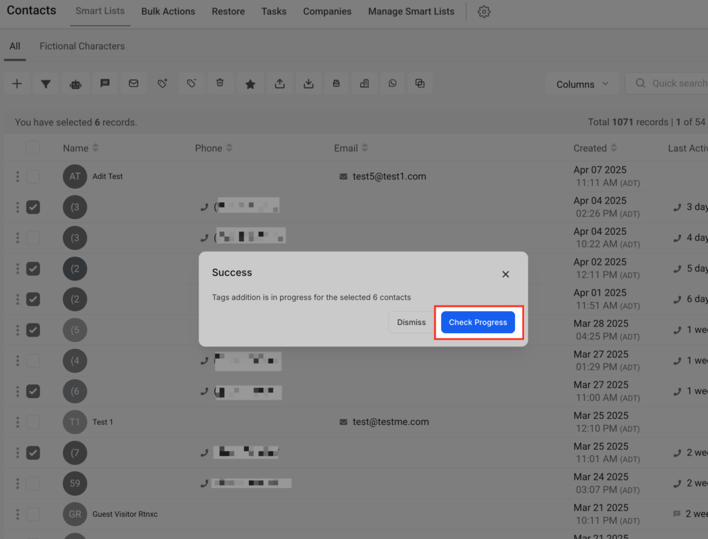 Este popup de confirmación aparece justo después de hacer Click en Add Tags. Te informa que la asignación de etiquetas está en progreso para los contactos seleccionados. Para monitorear la operación, puedes Click en el botón Check Progress, que te llevará a la pestaña Bulk Actions donde puedes rastrear en tiempo real el éxito o fracaso de la tarea.