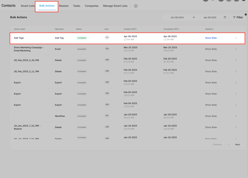 El área resaltada muestra que tu acción masiva de etiquetas se ha completado con éxito. Verás el nombre de la acción, quién la realizó, cuándo se creó y un enlace “Show Stats” para revisar los resultados. Esto te ayuda a confirmar que todo se aplicó según lo esperado.