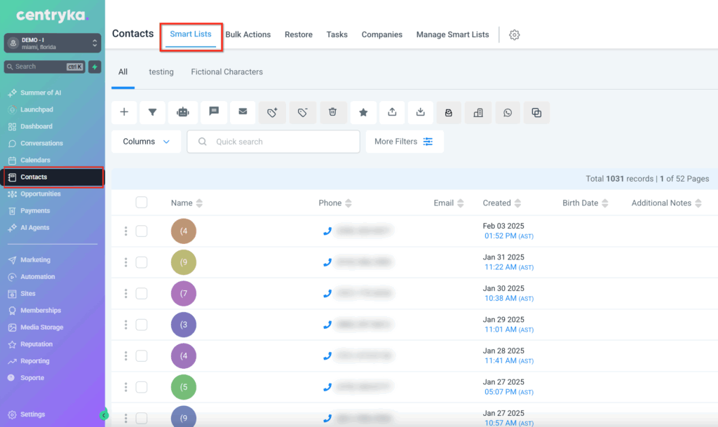 La página de Contactos es donde se almacenan todos tus leads, clientes y contactos de negocio. Este es el punto de partida para exportar tus datos. Navigate a Contacts → Smartlists.