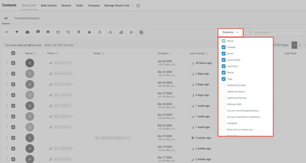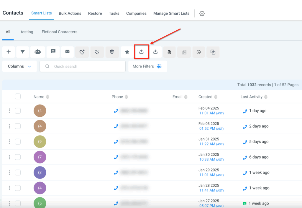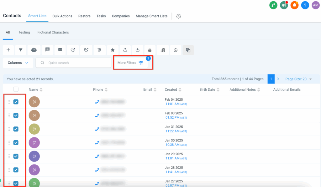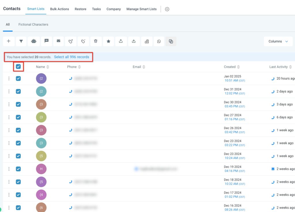 • Use los filtros en la parte superior para refinar tu selección (por ejemplo, filtrar por etiquetas, Smart Lists o atributos específicos).