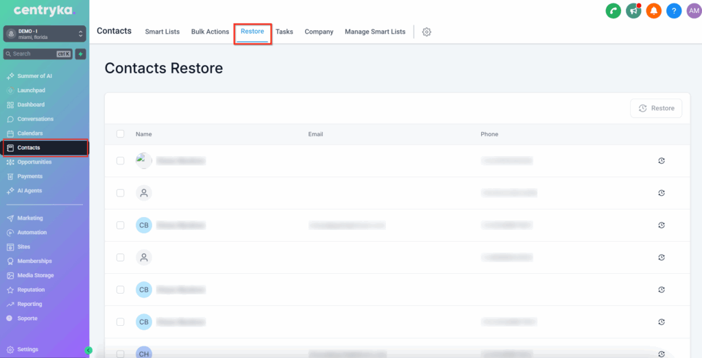 Ve a la sección Contacts en tu panel de Centryka y selecciona la pestaña Restore
