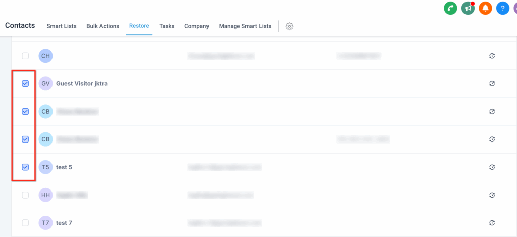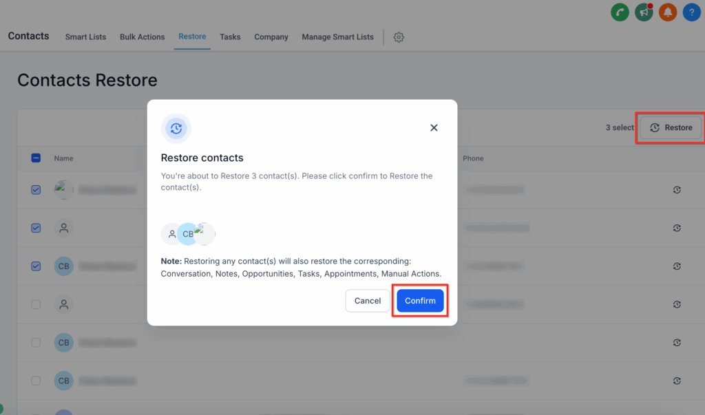 Haz Clic en el botón Restore junto al nombre del contacto y confirma la acción.