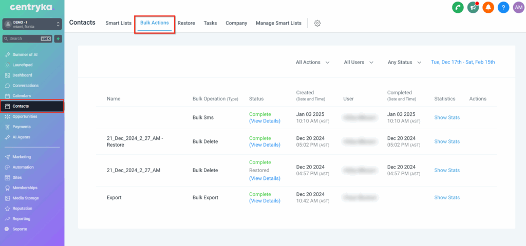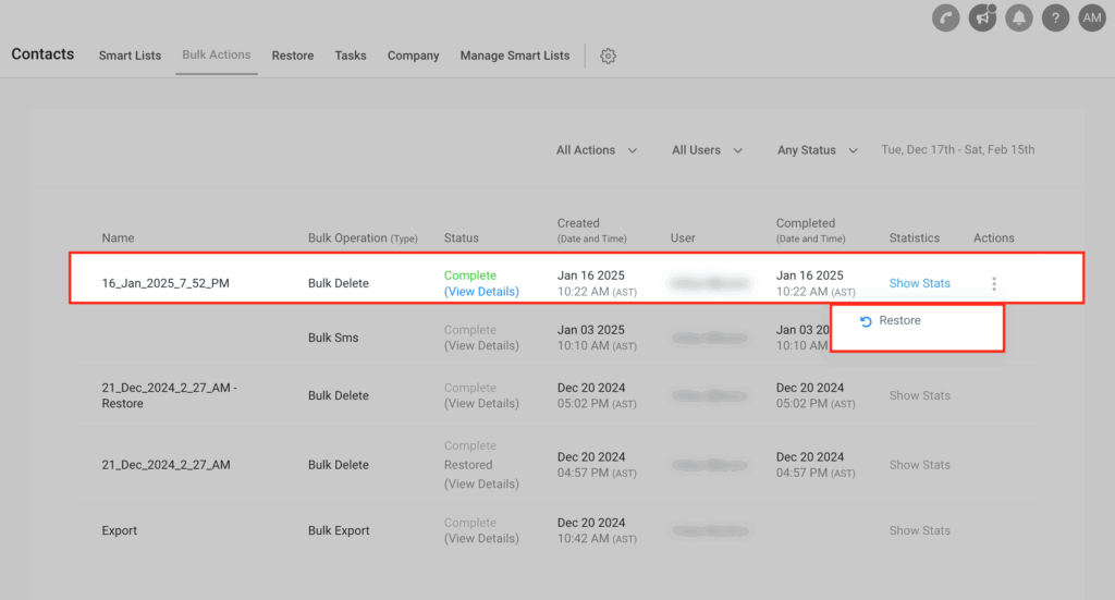 NOTA: El proceso de restauración comenzará de inmediato. Puedes monitorear el progreso en la página Bulk Actions, donde el estado cambiará a “In Progress” o “Completed”. Una vez completado, vuelve a la sección Contacts para verificar los contactos restaurados.