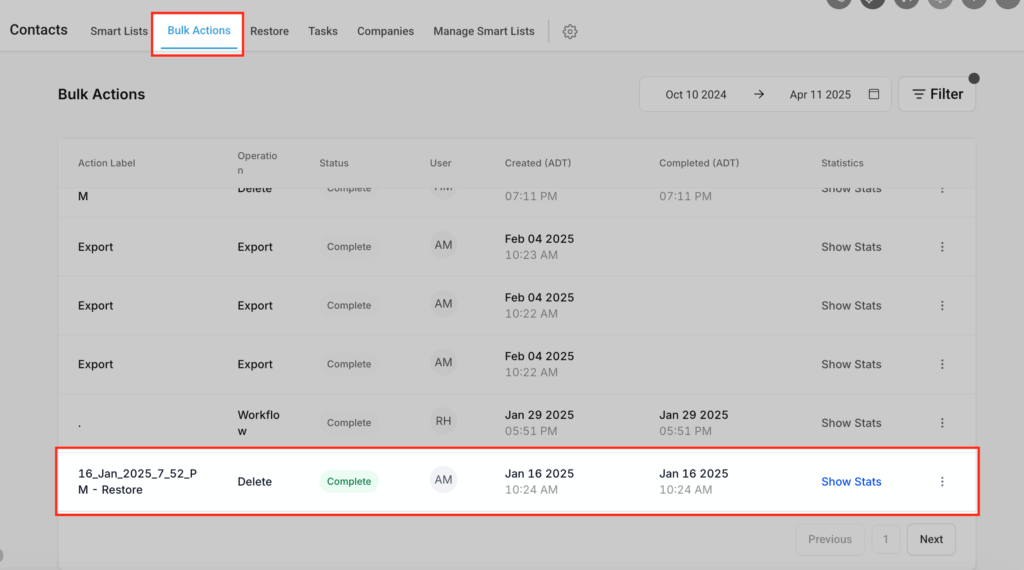 Ve a la sección Contacts y haz Click en Bulk Actions desde el menú de navegación. Esta página muestra el historial de todas las acciones masivas realizadas, incluidas las eliminaciones.