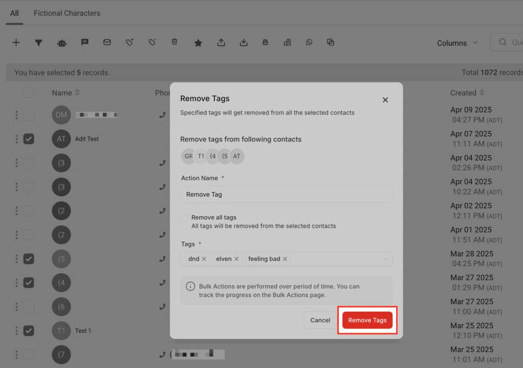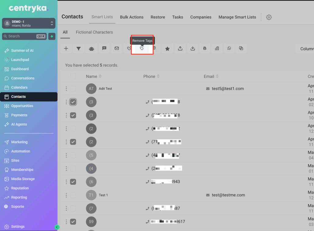 Con los contactos seleccionados, haz Clic en el icono Remove Tags ubicado en la barra de acciones superior. Esto abrirá el panel para la acción masiva.