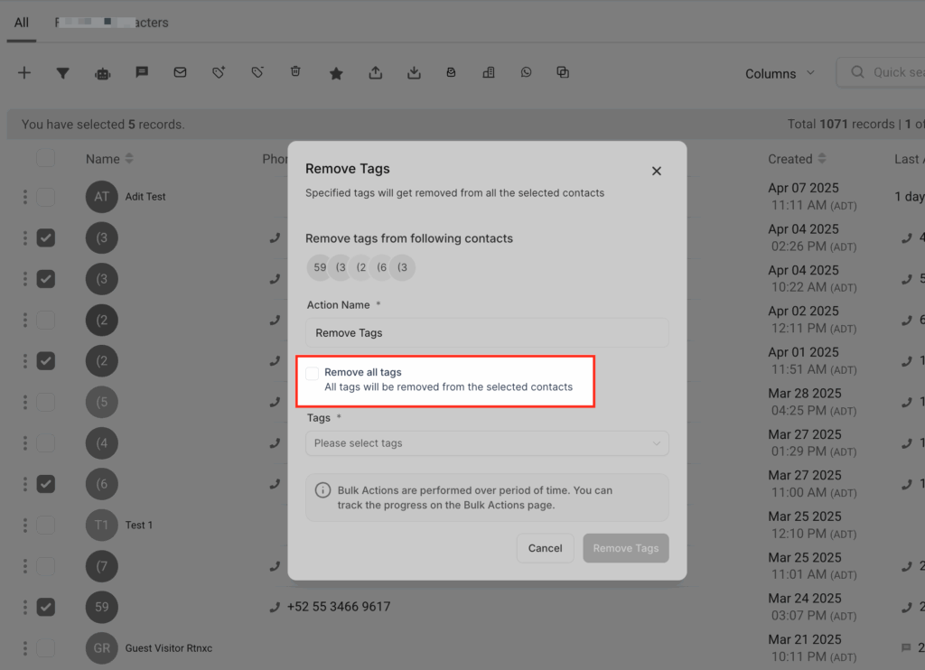 Si deseas borrar todas las etiquetas, marca la casilla Remove all tags. Esta opción elimina todas las etiquetas asociadas a esos contactos, sin necesidad de especificar etiquetas individuales. Es ideal para limpieza general o cuando quieres comenzar de nuevo con una nueva estructura de etiquetas. Asegúrate antes de activarla, ya que borra todo de una sola vez.