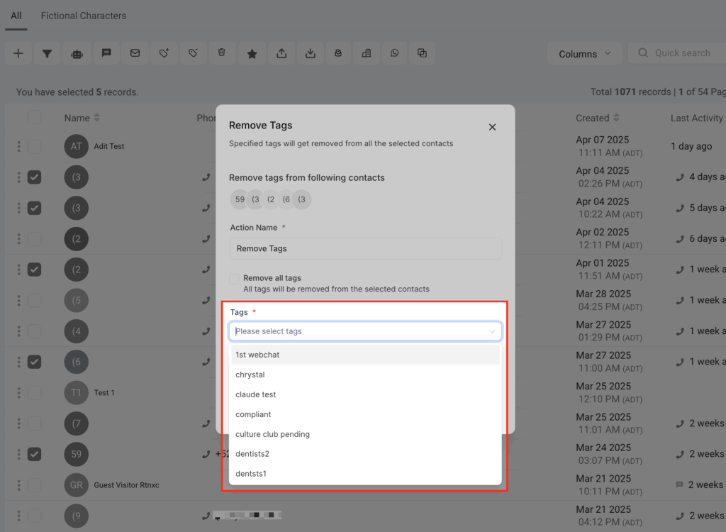 Usa el dropdown Tags para elegir una o más etiquetas a eliminar de los contactos seleccionados. La lista mostrará todas las etiquetas existentes; puedes desplazarte o buscarlas. Esto es útil cuando solo deseas eliminar etiquetas específicas y conservar otras. No marques “Remove all tags” si solo quieres eliminar etiquetas seleccionadas.
