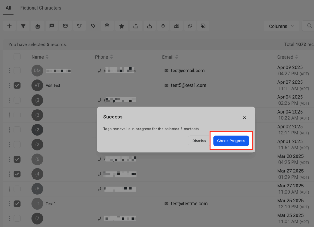 Después de enviar la acción, el sistema mostrará una confirmación. Haz Clic en “Check Progress” para seguir el estado en tiempo real de la acción masiva.