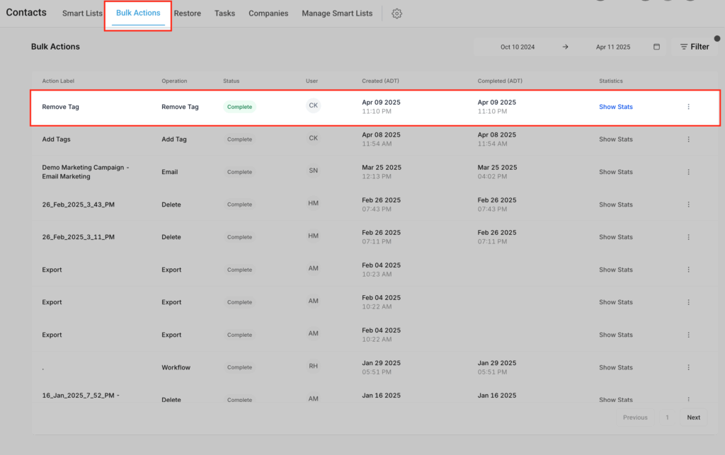 El panel Bulk Actions registra todas las operaciones de eliminación de etiquetas. En él verás el nombre de la acción, hora de inicio, hora de finalización y un enlace Show Stats para ver los resultados detallados, incluyendo el estado por contacto.