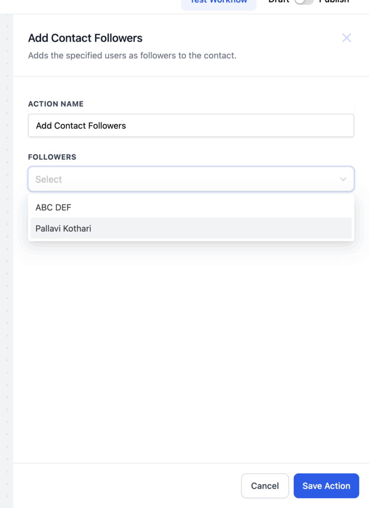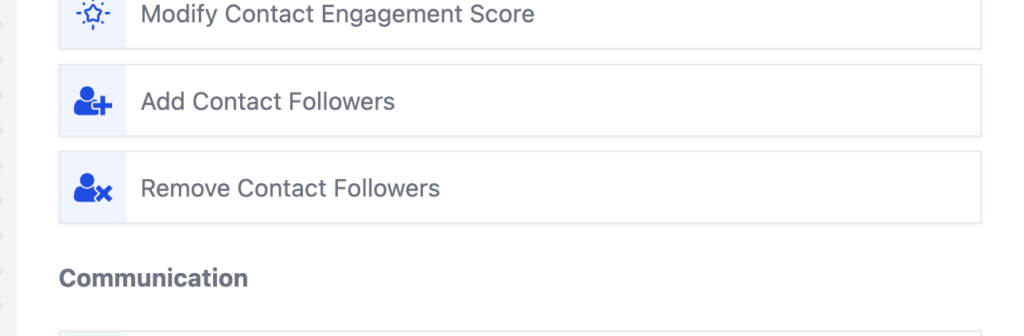 Utiliza las acciones de workflow “Add Contact Followers” y “Remove Contact Followers” para actualizar automáticamente los seguidores de un contacto. Esta acción puede añadirse a tus flujo de trabajo existentes para facilitar la gestión de seguidores en tu negocio.