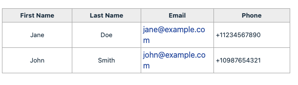 | Phone Number | E.164 (+11234567890) recomendado; también 123-456-7890, (123) 456-7890 (solo EE.UU.) |