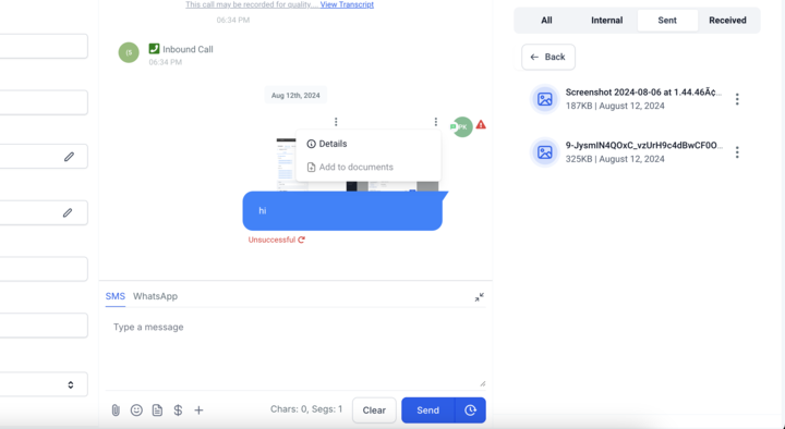 Sí. Cuando se recibe un archivo por WhatsApp o SMS, puedes usar el mismo proceso para añadirlo a los documentos del contacto. Solo haz Click en el menú de tres puntos junto al mensaje y selecciona Add to Documents.