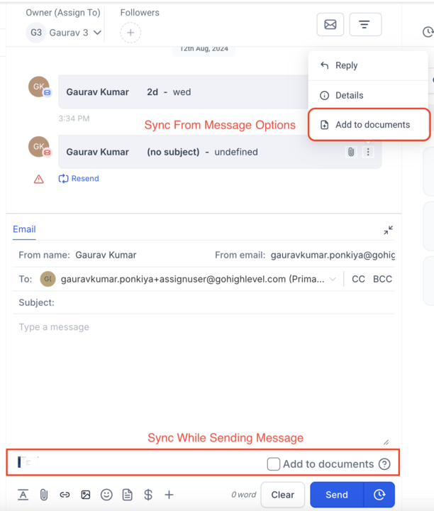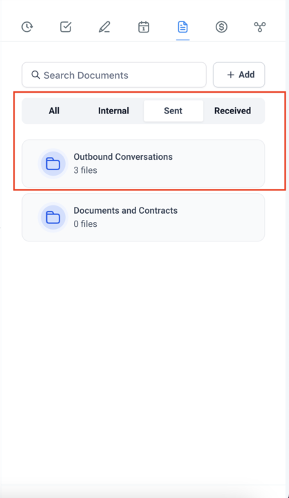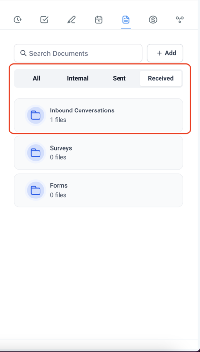 Sincroniza sin esfuerzo todos los archivos recibidos en los mensajes al sistema de gestión de documentos del contacto. Solo haz Click en los tres puntos de un mensaje que contenga archivos adjuntos y selecciona Add to Documents.