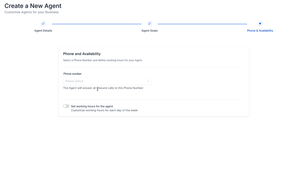 También puedes configurar el horario laboral del agente de IA, definiendo días y horarios específicos en los que el agente debe atender llamadas.