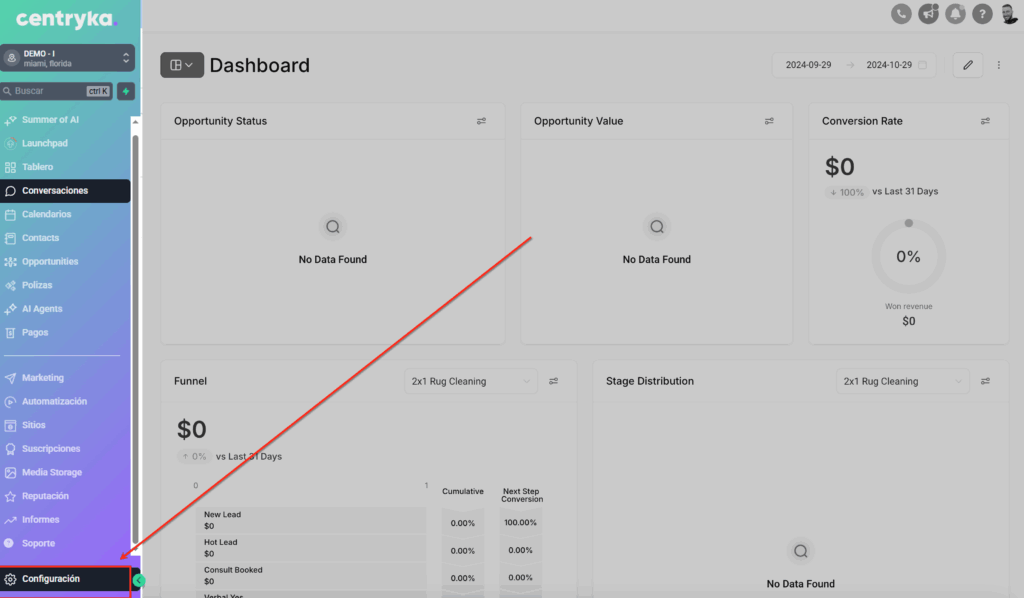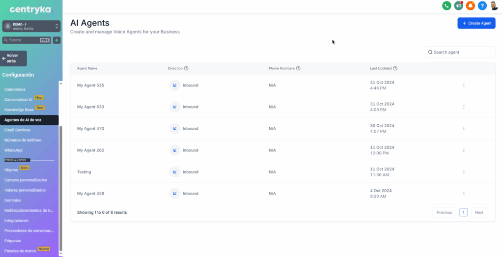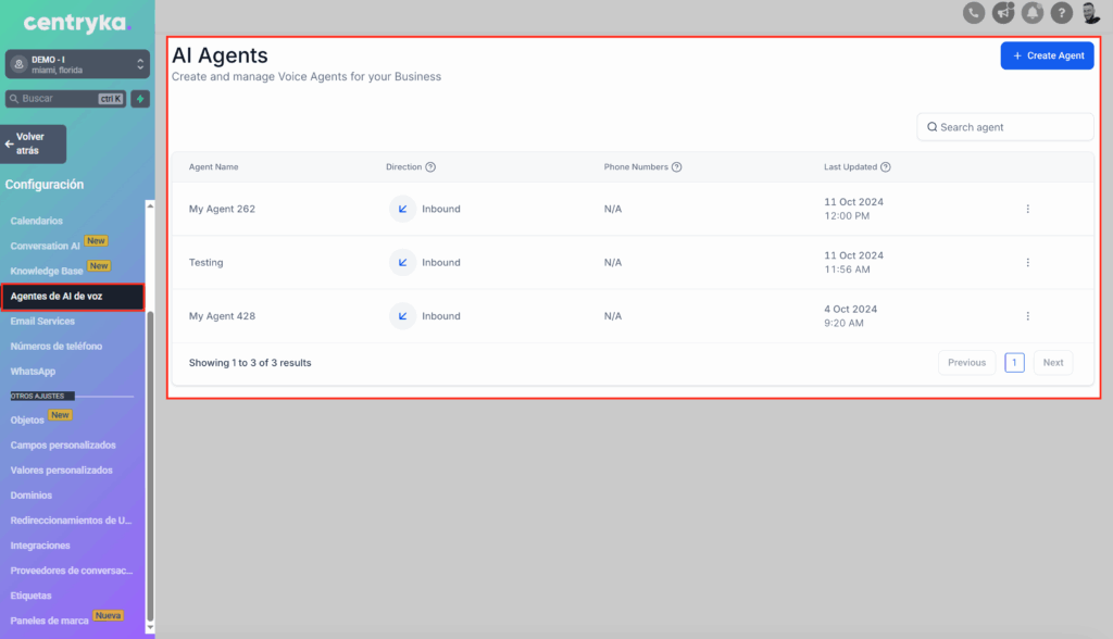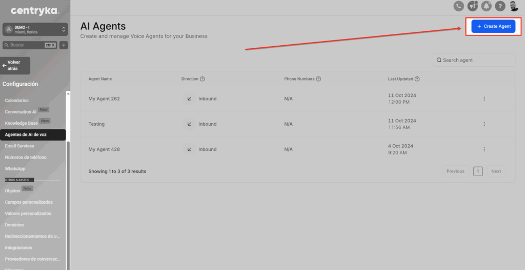 Desde cualquier parte de tu subcuenta, ve a Settings > AI Agents. Una vez estés en la sección de AI Agents, puedes comenzar a configurar tus agentes de voz con IA.