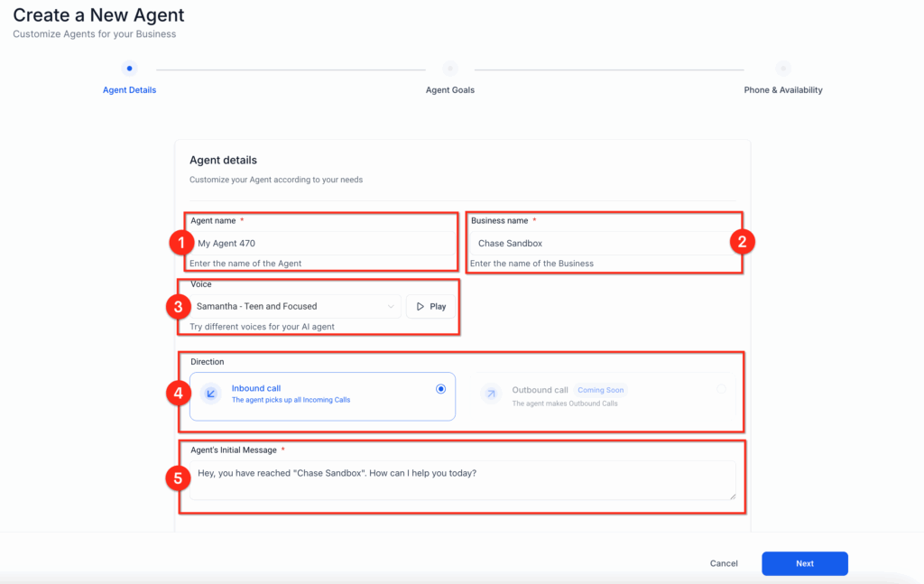 - Initial Greeting Message: Personaliza el primer mensaje que dirá tu agente (por ejemplo: “Hola, has contactado a [Nombre del Negocio]. ¿En qué puedo ayudarte hoy?”).