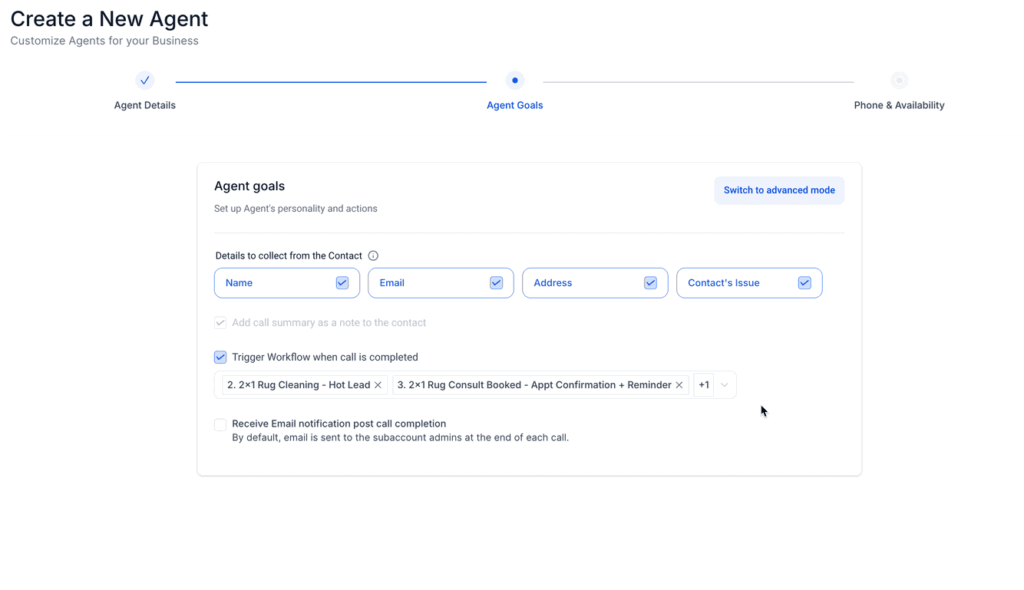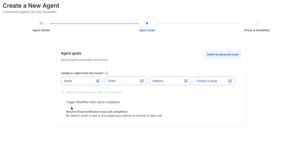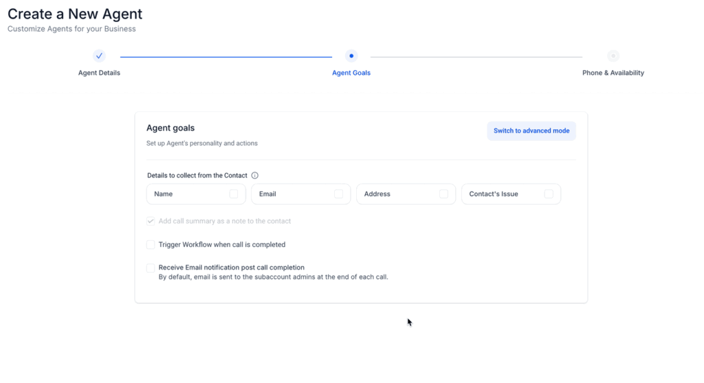 Tienes dos opciones para configurar los objetivos de tu agente: Basic Mode o Advanced Mode.