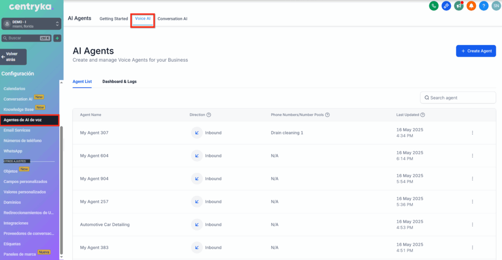 Desde tu cuenta de CENTRYKA, haz clic en AI Agents y luego en la opción Voice AI.