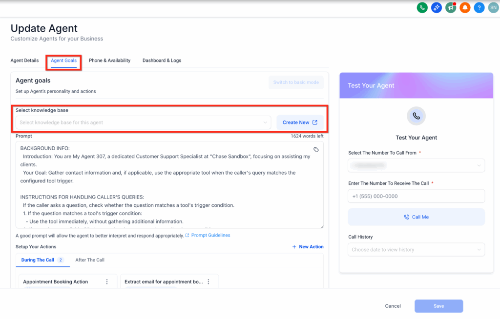 ¡Bienvenido a una forma más inteligente de potenciar tus agentes de Voz con IA! La nueva integración de la base de conocimiento para agentes de Voz con IA en CENTRYKA te permite ofrecer respuestas precisas y conscientes del contexto al conectar cada agente con una base de conocimiento dedicada, activada por instrucciones personalizadas y consultas dinámicas de los usuarios.
