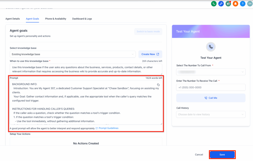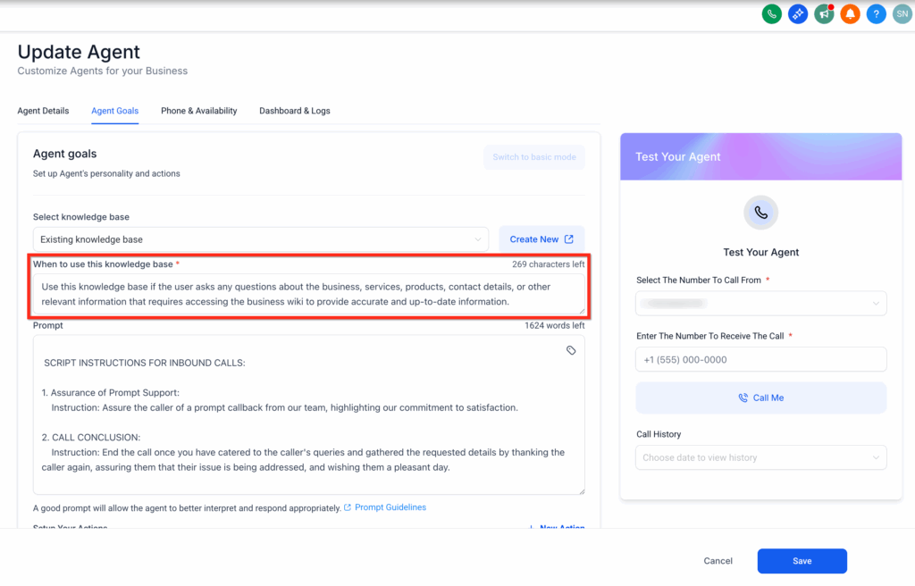 Haz clic en Guardar para aplicar la configuración y vincular la base de conocimiento al agente.
