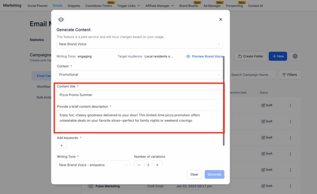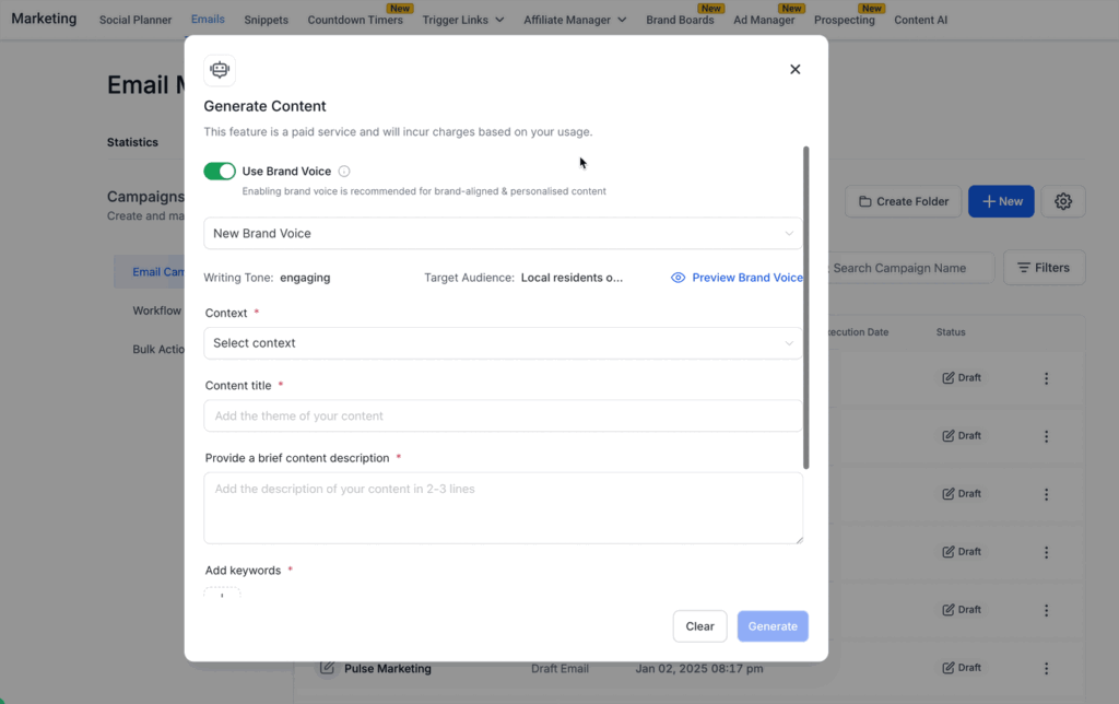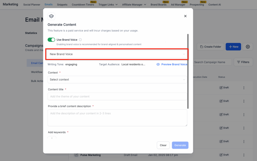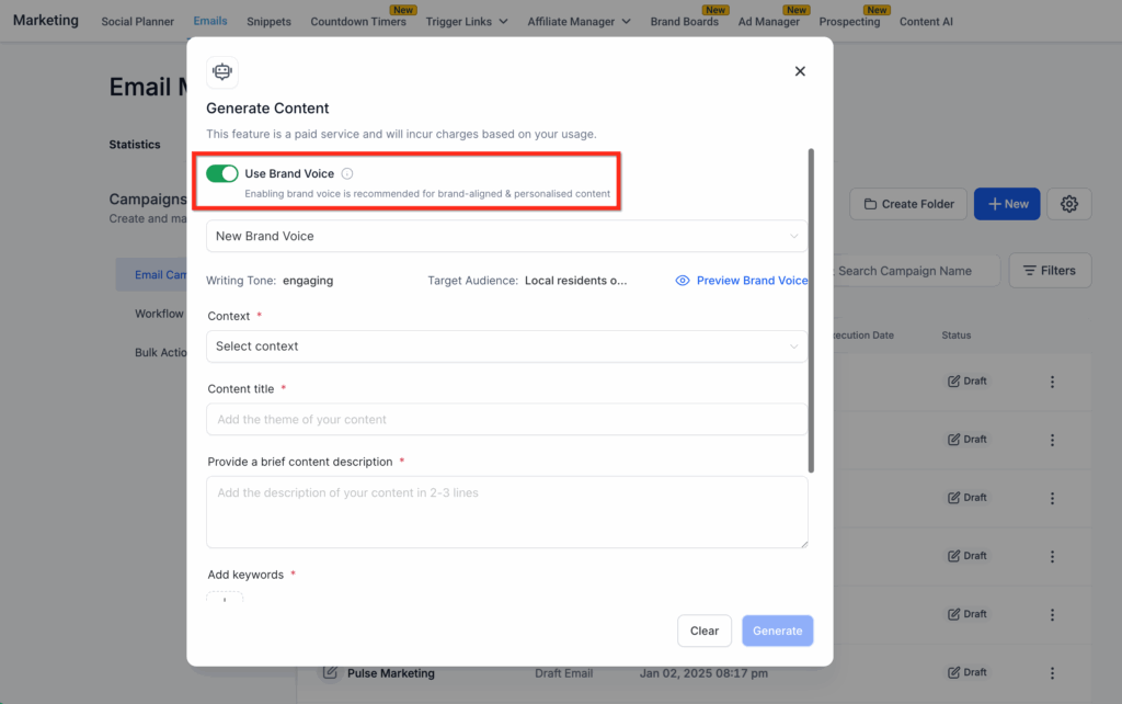 Nota: Cuanto más detallada y precisa sea tu configuración de Voz de Marca, más relevante y de calidad será el contenido generado por IA.