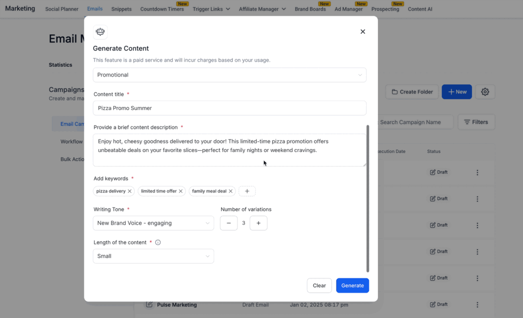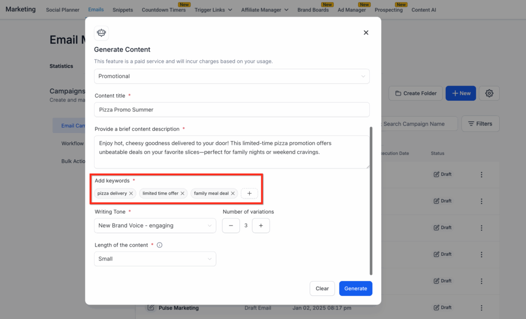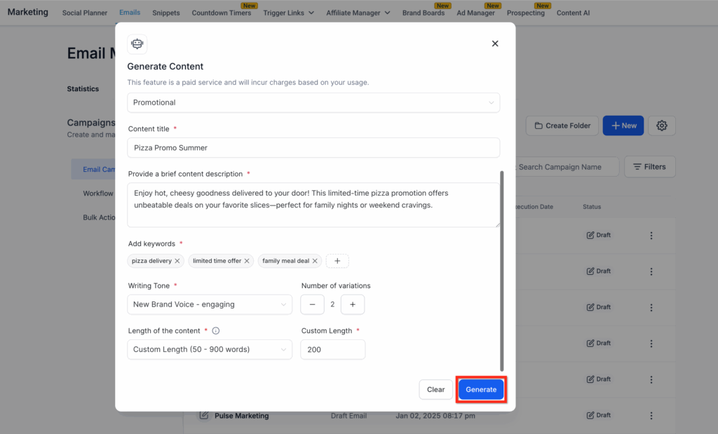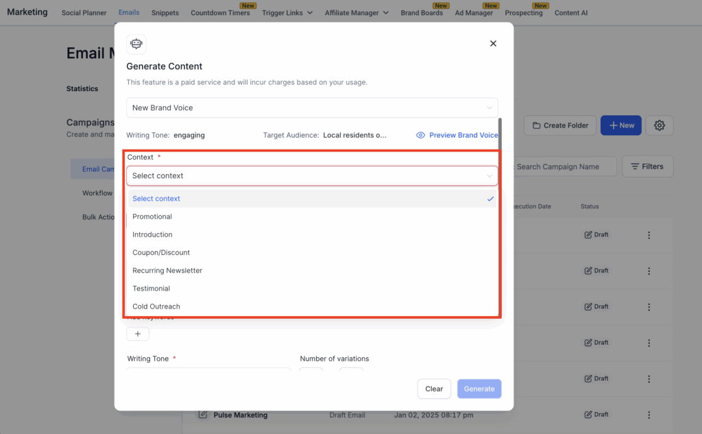 • Navega a cualquier herramienta que admita Content AI, como Emails, Blogs, Funnels, Websites o Social Planner.